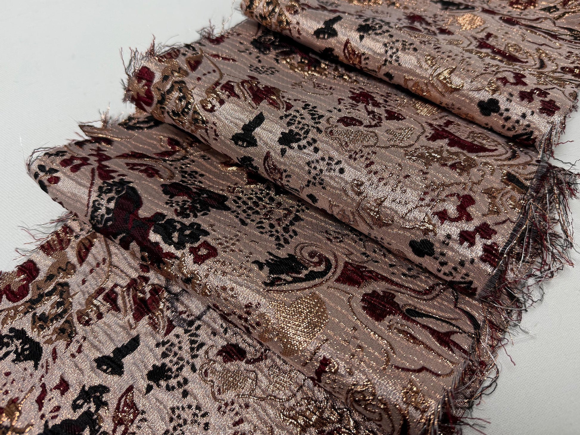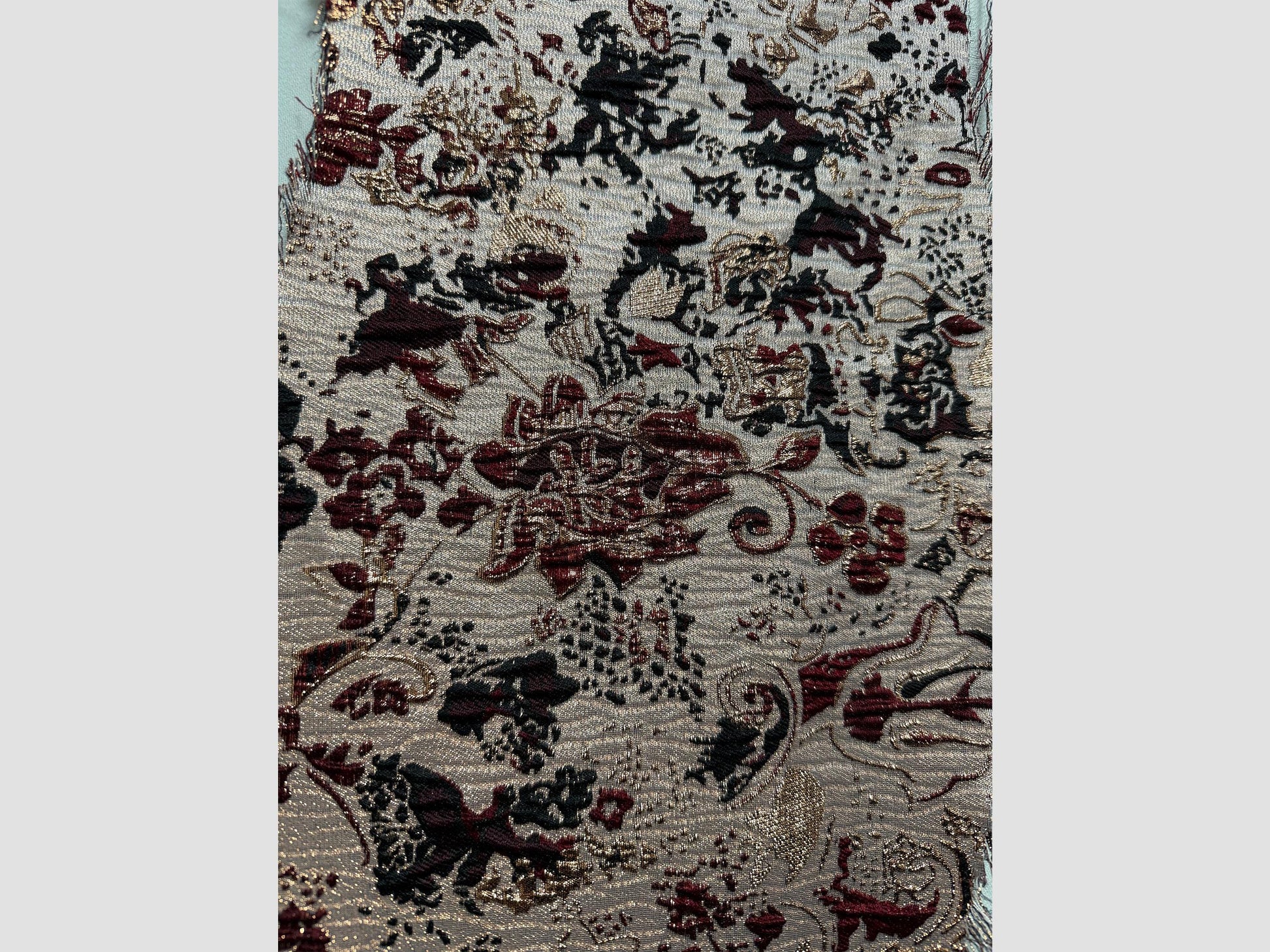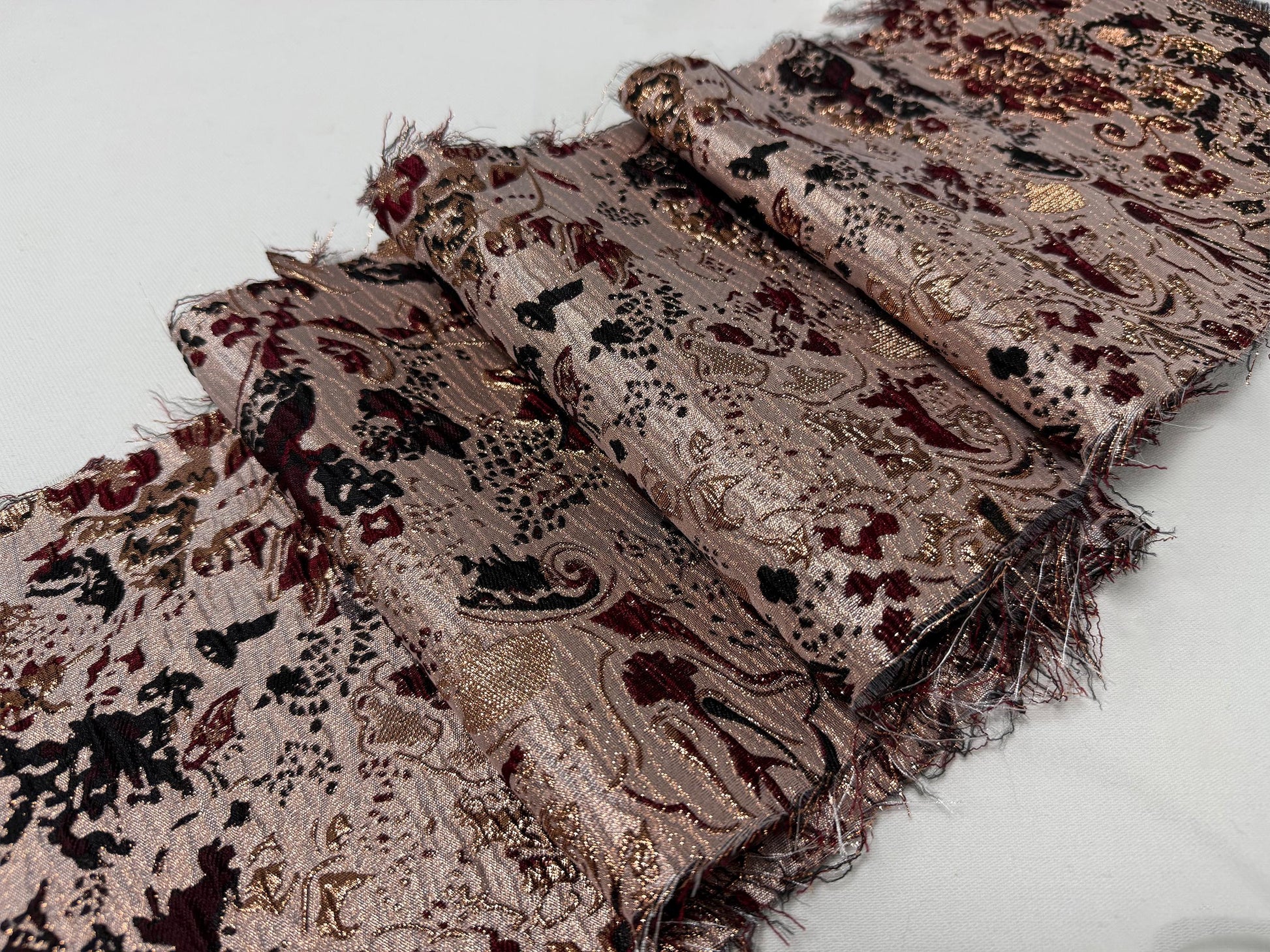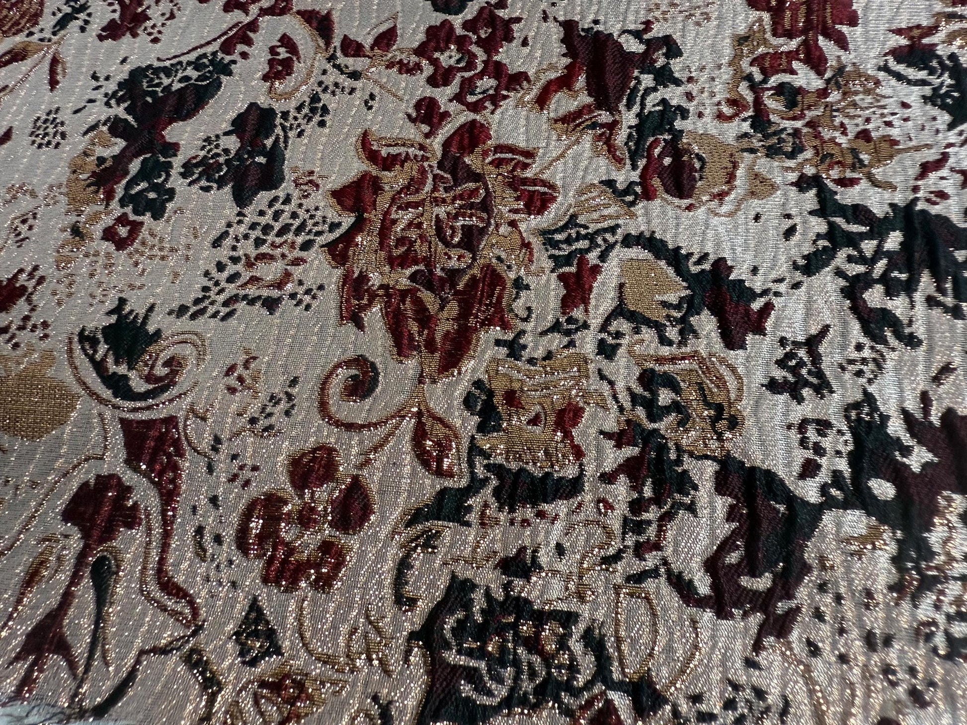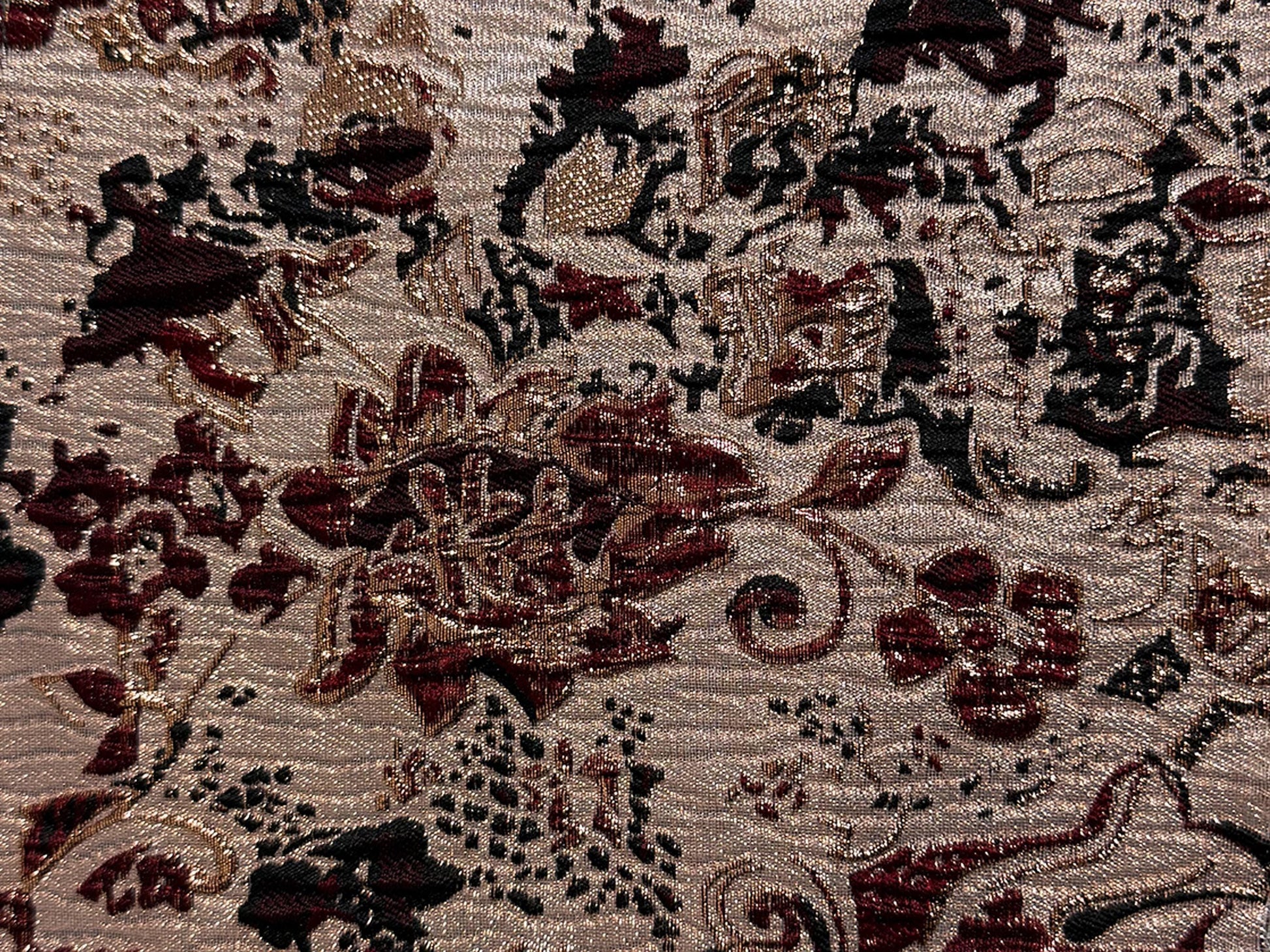Bu zarif barok tarzı jakarlı kumaşla bir sonraki projenizi bir üst seviyeye taşıyın. Bordo, yeşil ve altının zengin tonlarında karmaşık bir çiçek desenine sahiptir. Parıldayan metalik ipliklerle dokunan bu kumaş, her türlü yaratıma bir lüks ve derinlik dokunuşu getirir. Döşemelik, perde ve moda tasarımı için mükemmel olan bu orta ağırlıktaki kumaş dayanıklı ve rafinedir. Kabartmalı jakarlı dokuma, doku ve zarafet katarak hem dekoratif hem de giyilebilir parçalar için uygun hale getirir. Bu barok kumaş, dokulu kumaş yüzeyine dokunmuş güzel bir metalik çiçek desenine sahiptir ve ona zengin ve klasik bir görünüm kazandırır. Döşemelik kumaş projeleri üzerinde çalışıyor, perde kumaş panelleri hazırlıyor veya göz alıcı bir giysi yaratıyor olun, bu vintage tarzı kumaş her türlü yaratıma sofistike bir görünüm katar. Elbise dikimi kumaş ihtiyaçları veya hatta saç fiyonku kumaşı gibi aksesuarlar için mükemmeldir, ihtişamı çok yönlülükle harmanlar. Karmaşık çiçekli jakar detayları ve brokar tarzı dokuma, bunu zarif ev dekoru veya moda için öne çıkan bir seçim haline getirir. Dekoratif bir kumaş olarak ideal olan bu lüks kumaş, vurgu yastıklarından gösterişli elbiselere kadar her şeye uyar ve tasarladığınız her şeye güzellik katar.