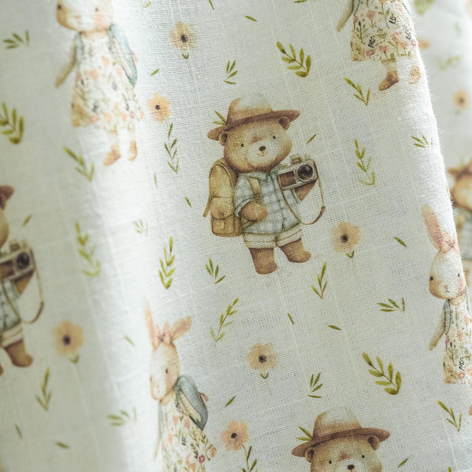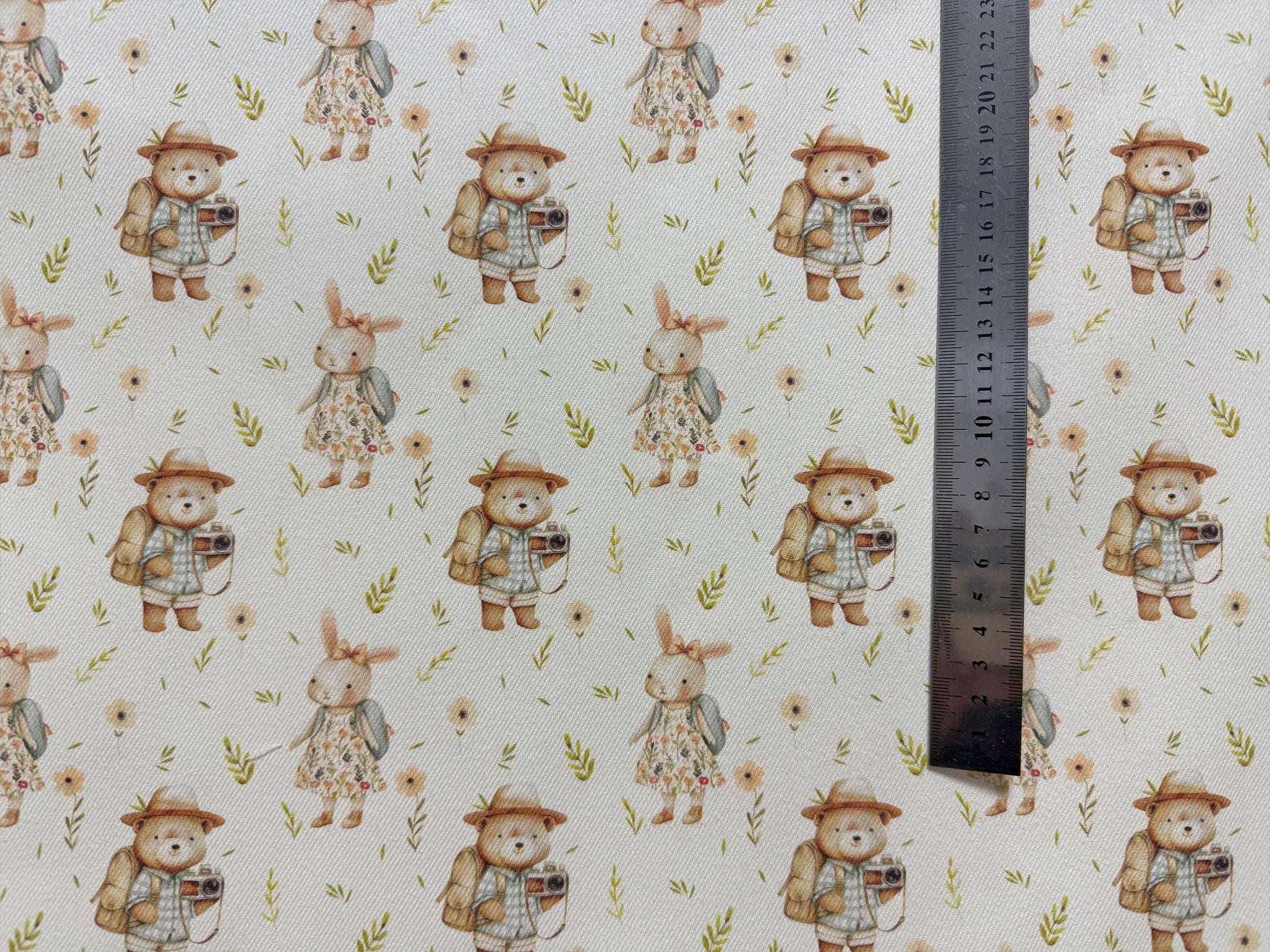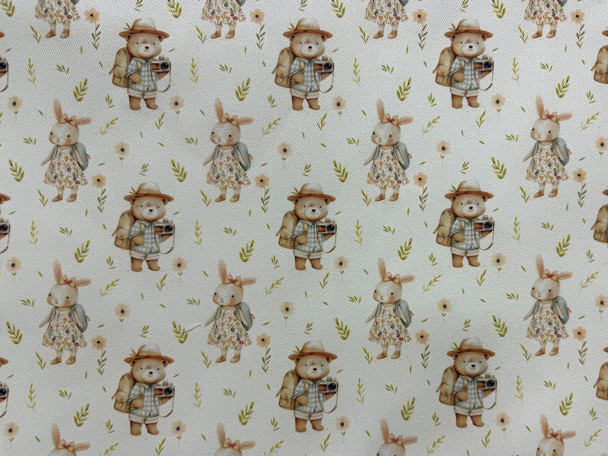 Ayı ve Tavşan Baskılı Kumaş - Sevimli Hayvanlar ve Bitkiler - Muslin, Poplin, Keten, Saten, Denim, Gabardin, Su Geçirmez Üzerine Özel Baskılı