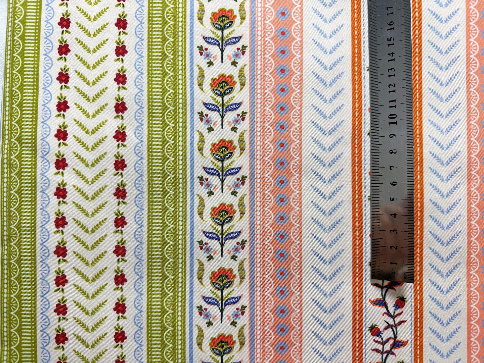 Bu bohem çiçekli çizgili kumaşla yaratıcı projelerinize canlı bir cazibe katın! Renkli çiçekler, yapraklar ve geometrik vurgulardan oluşan etnik esintili dikey bir desene sahip olan bu baskı, çok çeşitli kumaş el sanatları ve moda ürünleri için mükemmeldir. Bu tasarım, projenizin ihtiyaçlarına uyacak şekilde çeşitli kumaş türlerine basılabilir.