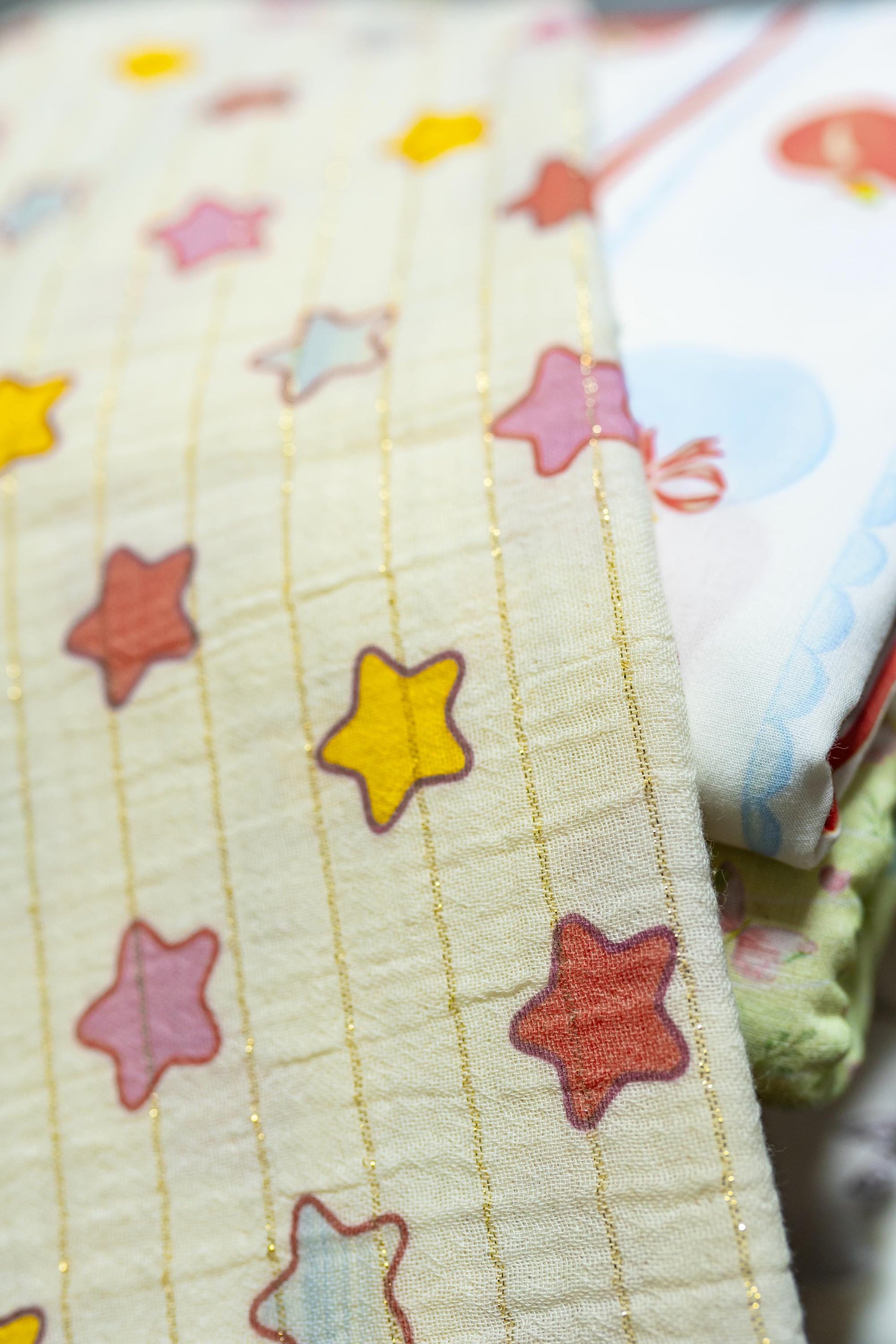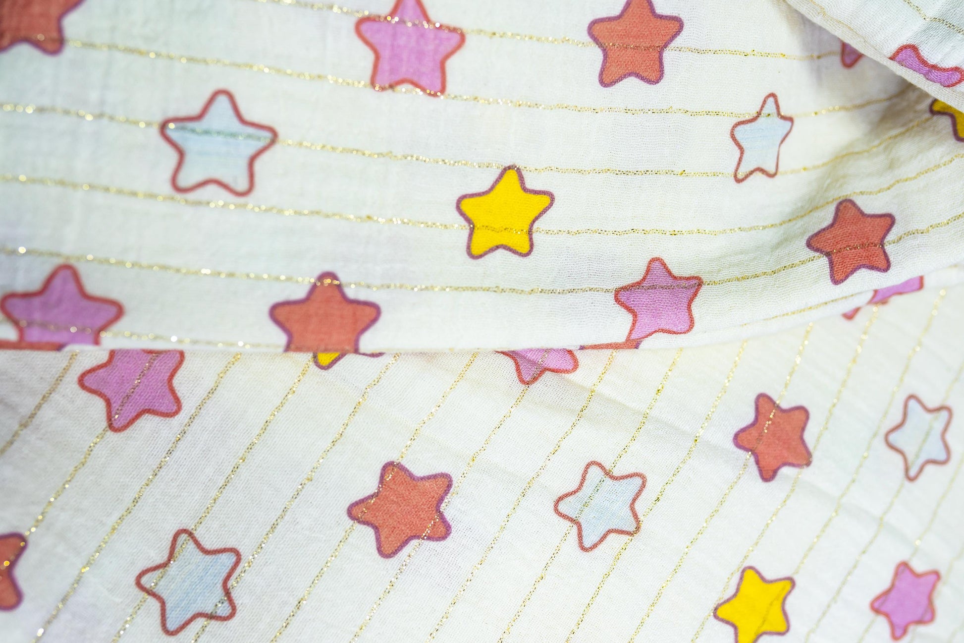 Canlı renkli yıldız desenine sahip çift katmanlı müslin kumaşımızla projelerinize yaratıcılık katın. Yumuşak, nefes alabilen ve hafif olan bu kumaş, bebek ürünleri, battaniyeler, dekoratif ürünler veya benzersiz dikiş projeleri hazırlamak için mükemmeldir. Yüksek kaliteli pigment baskı tekniği, renklerin zaman içinde canlı kalmasını sağlayarak günlük kullanım ve özel kreasyonlar için idealdir.