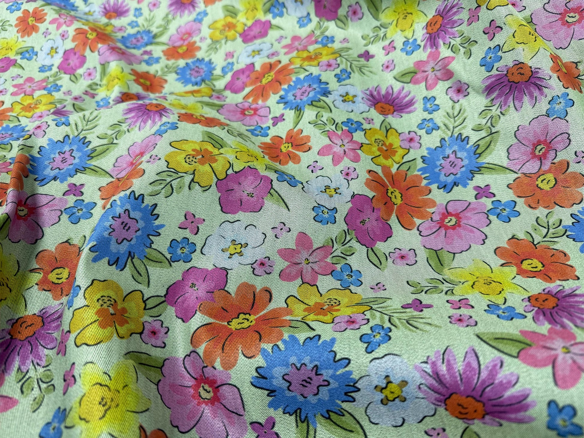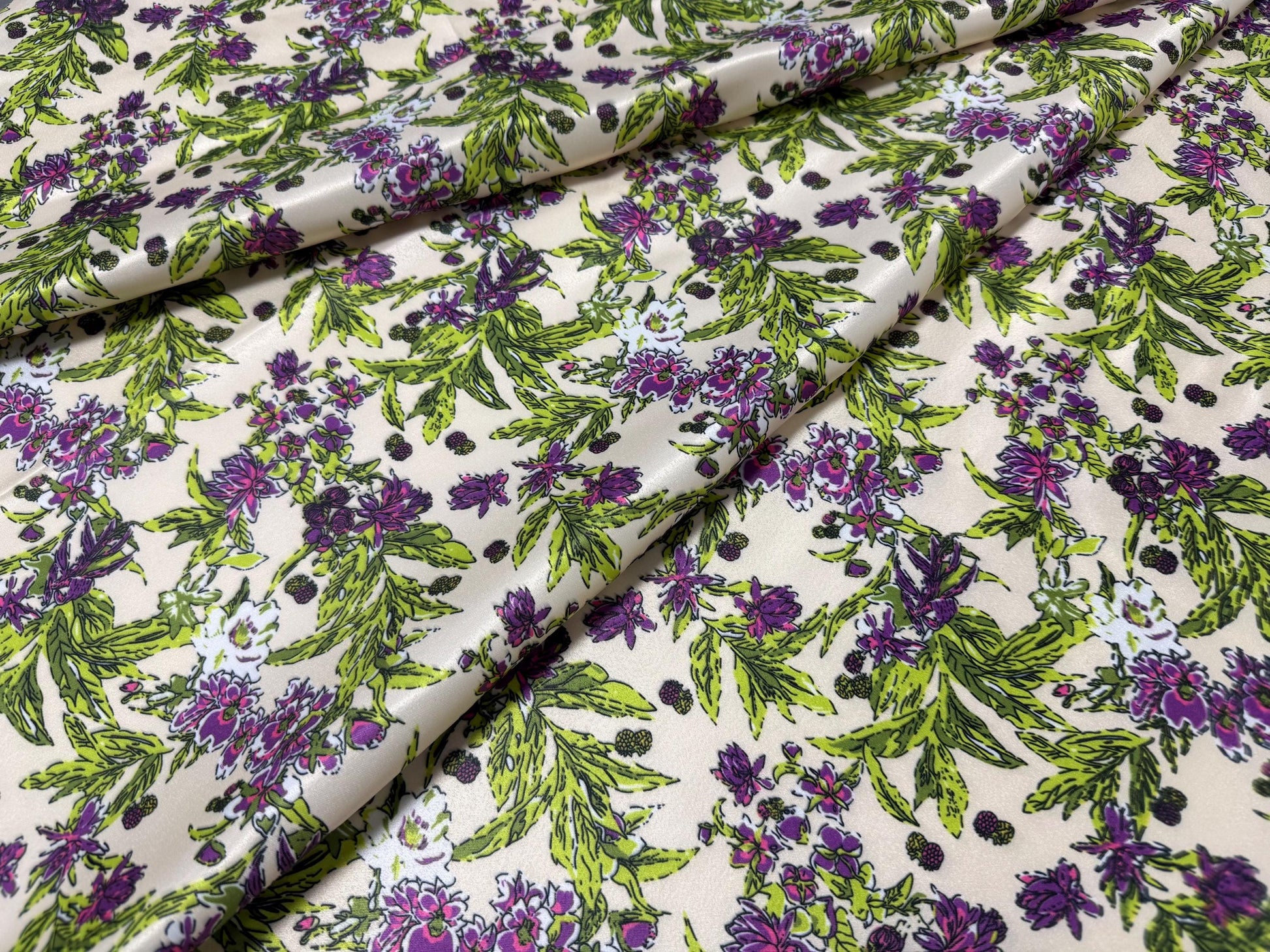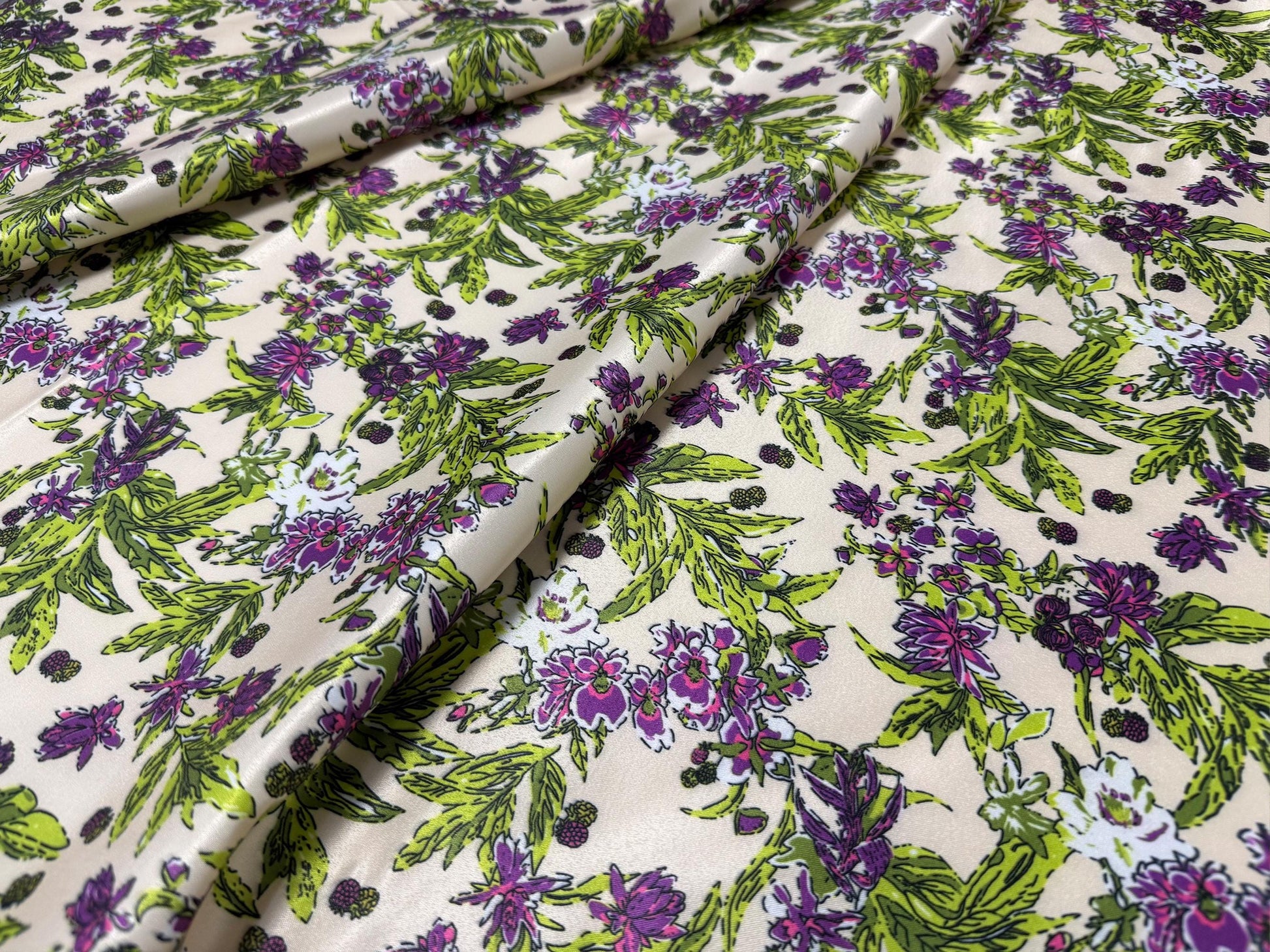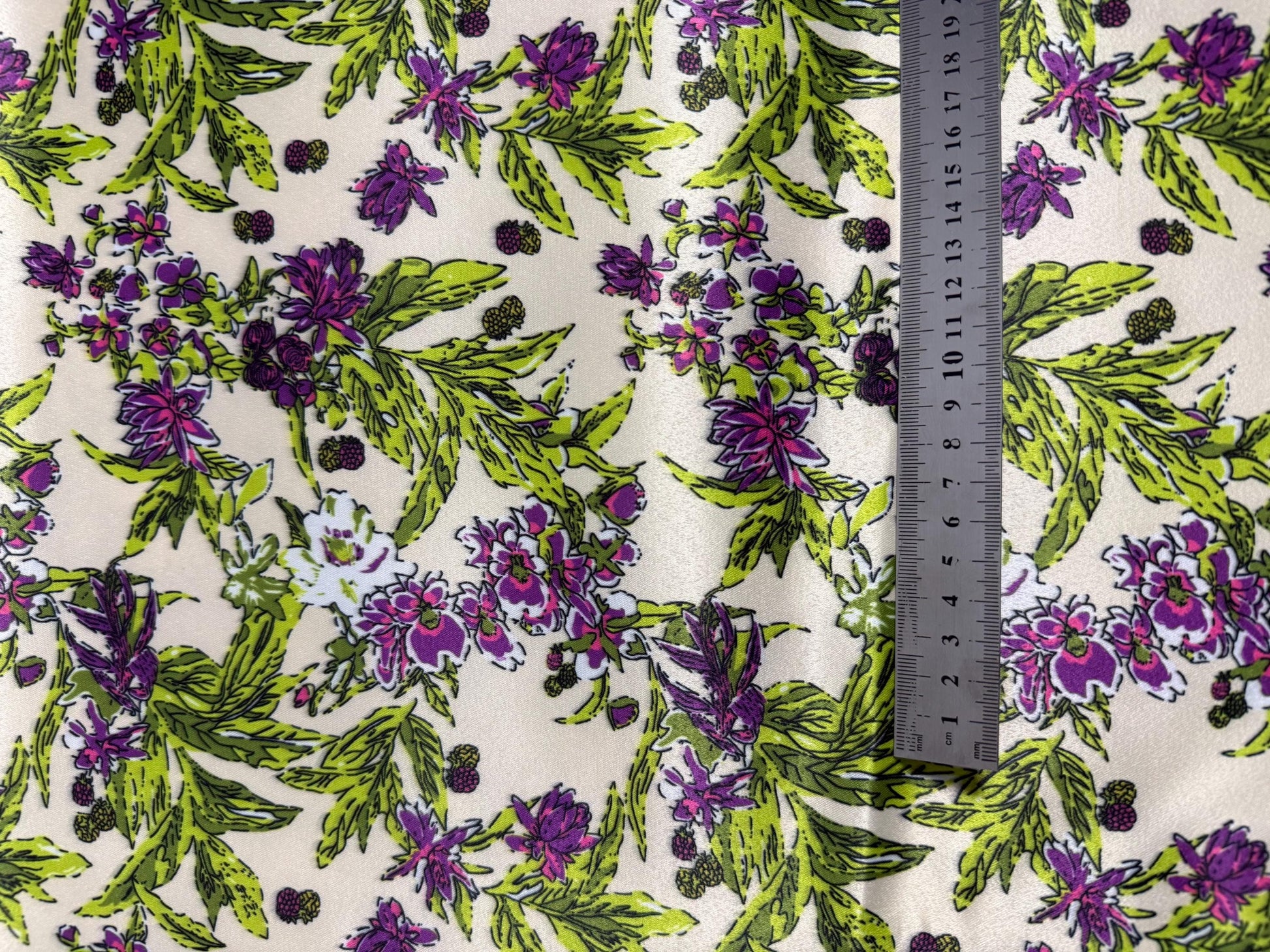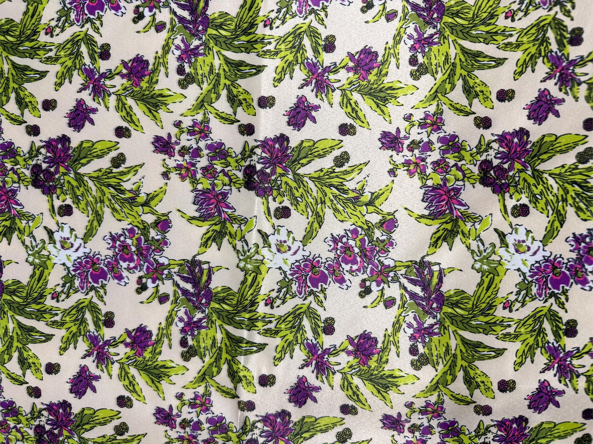 Mor Çiçeklerle Çiçek Desenli Kumaş – Muslin, Poplin, Keten, Saten, Kot, Gabardin ve Su Geçirmez Kumaş Üzerine Özel Baskı