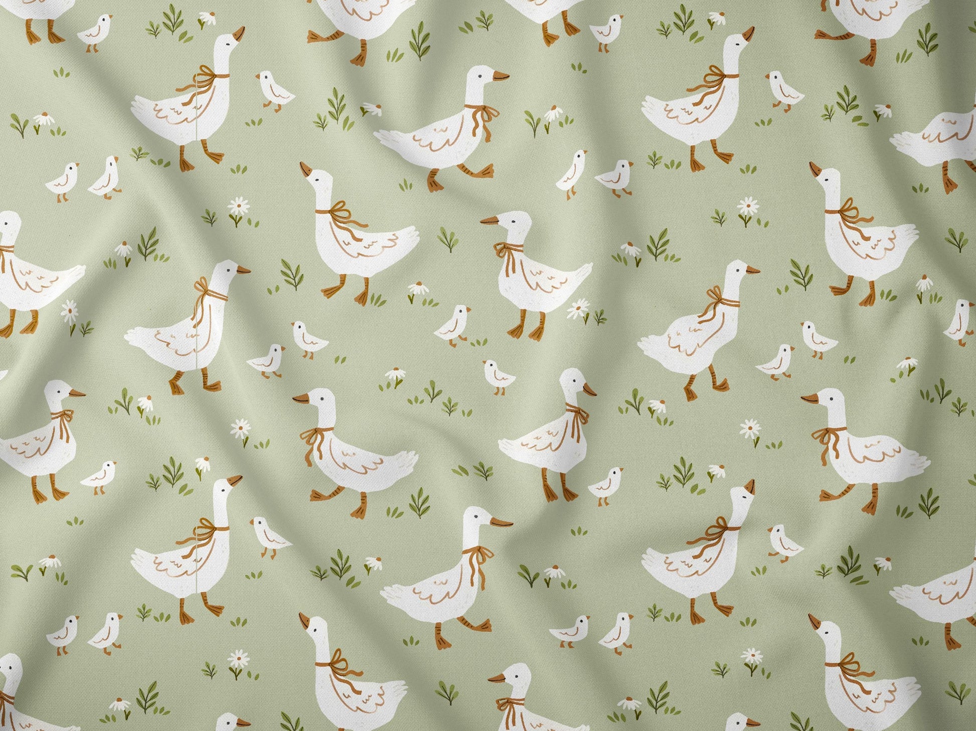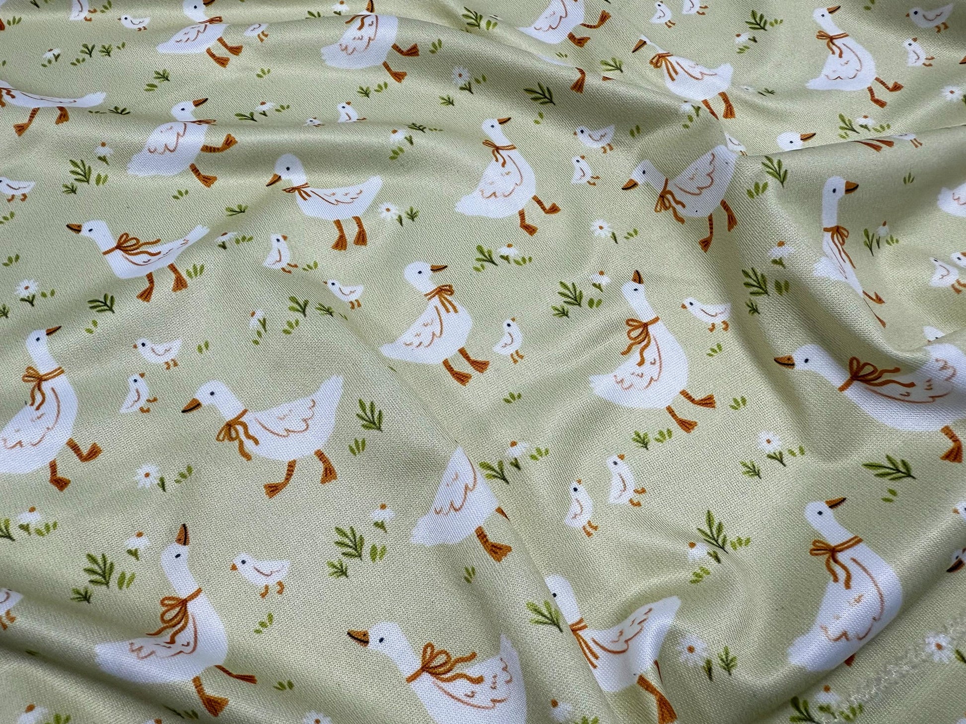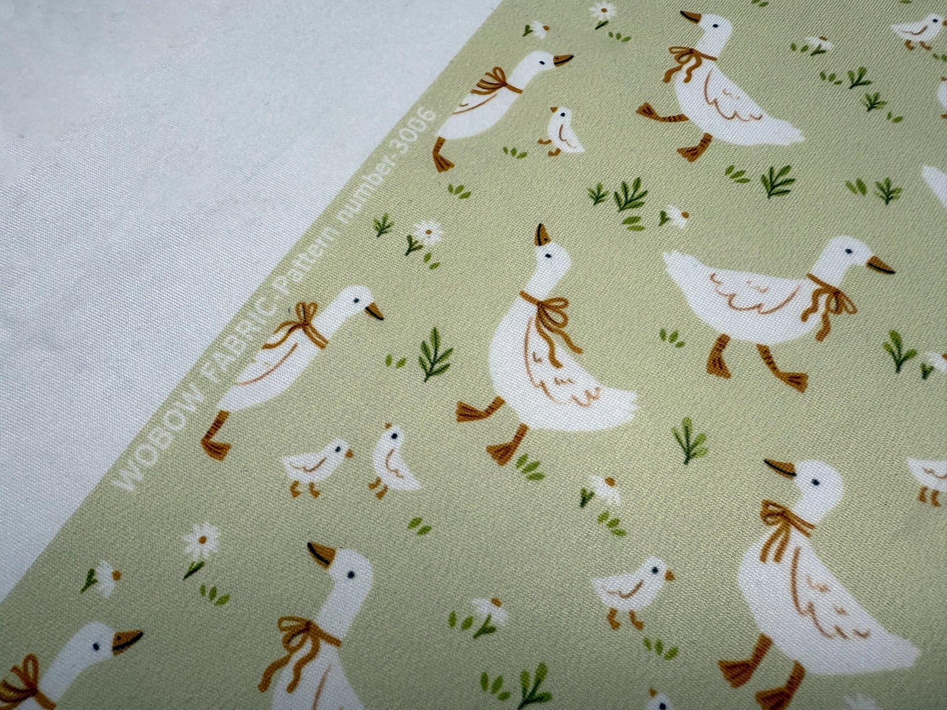Yeşil Çiçek ve Ördek Baskı Kumaş - Lüks Transfer Baskılı Saten, Müslin, Poplin, Keten, Saten ve Denim Üzerine Mevcut - Özelleştirilebilir