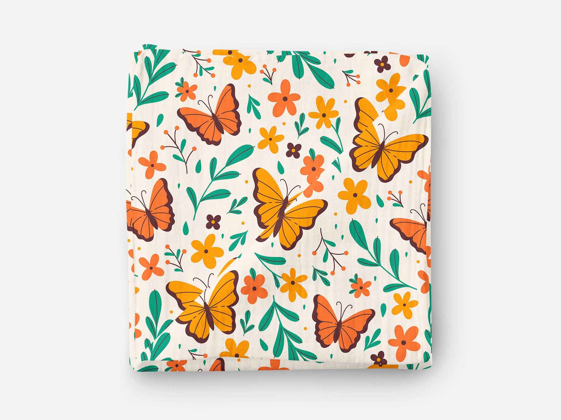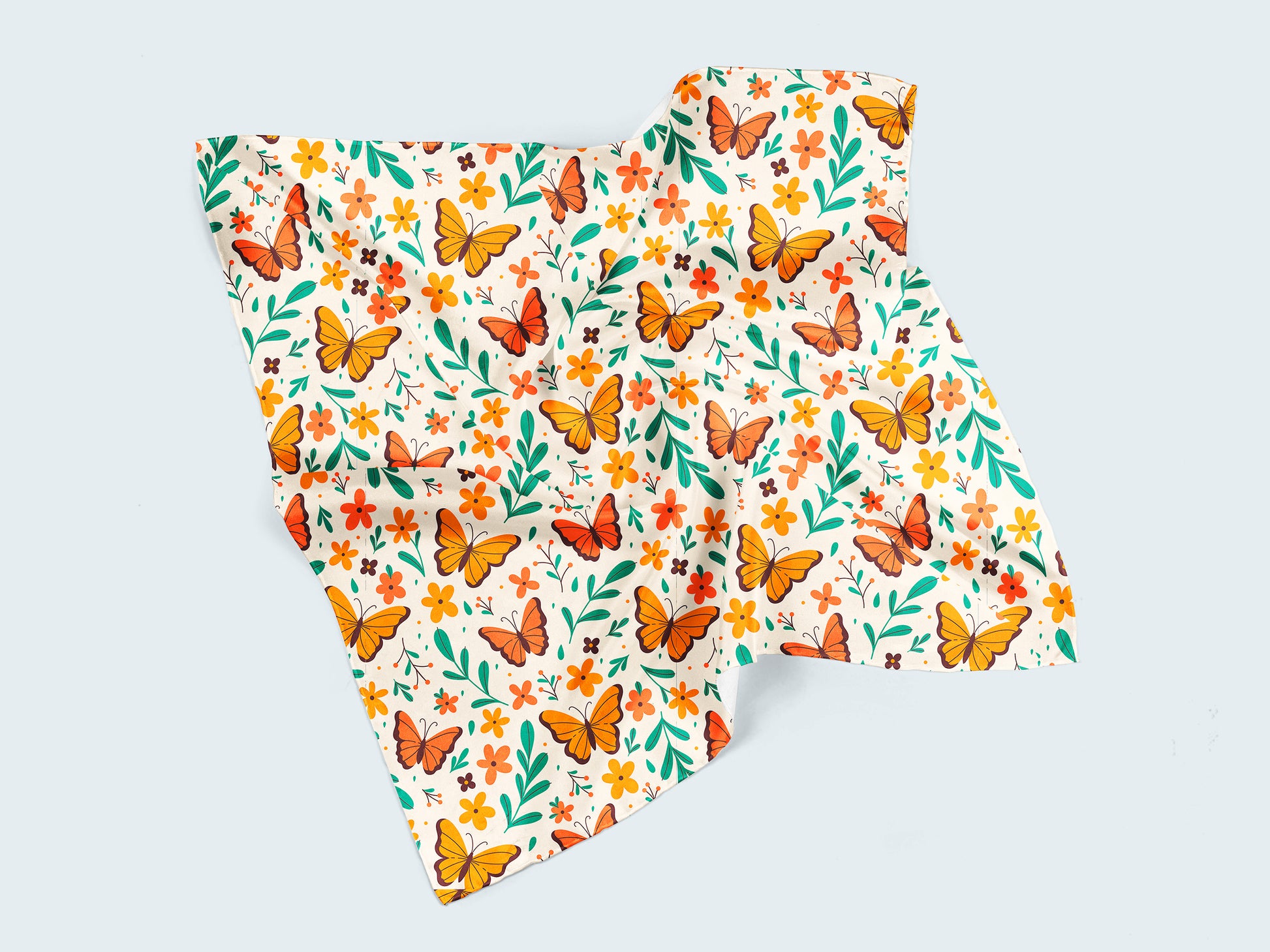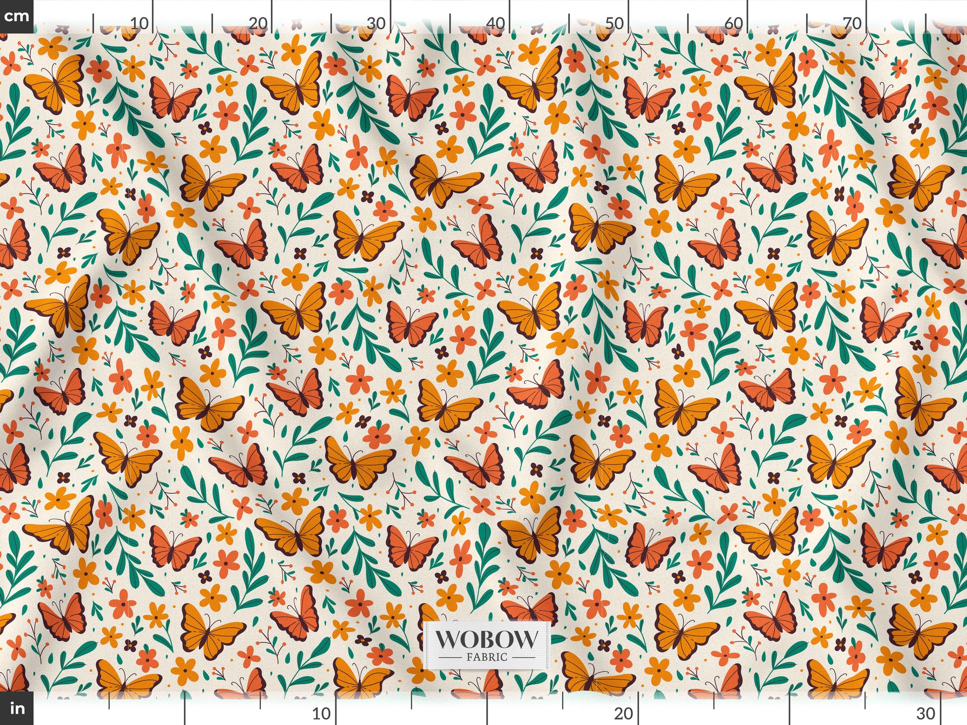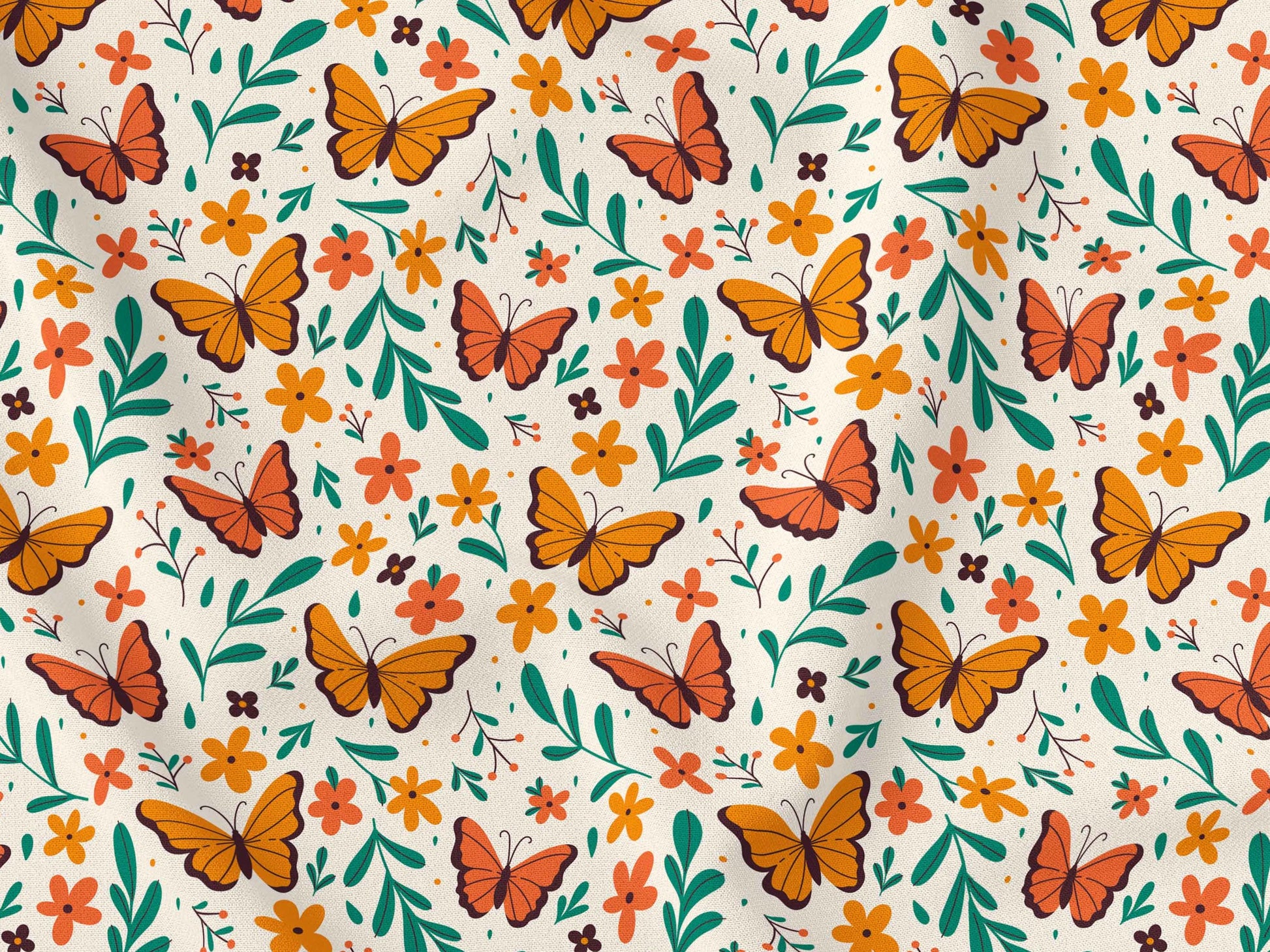 Neşeli turuncu kelebekler ve çiçeklerle bezeli bu canlı kumaş, projelerinize enerji katacak! Yeşil yaprak detaylarıyla zenginleşen desen, yazlık elbiselerden ev dekoruna kadar her türlü yaratıcı fikre uygun.