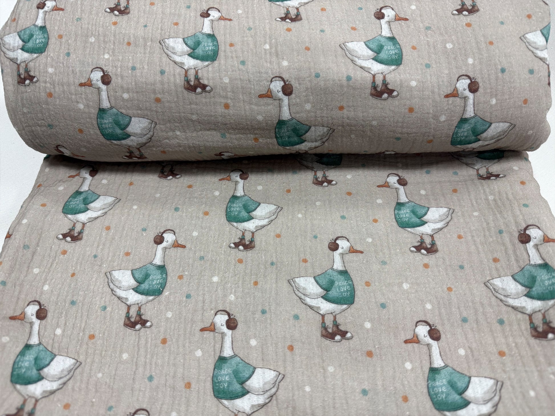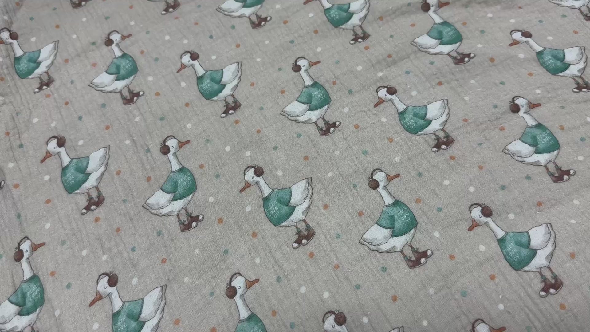 Sevimli puantiyeli ördek desenimizle çocuk odalarına ve dikim projelerine neşe katın! Bu özel baskılı kumaş; bebek giysileri için yumuşak müslin, yazlık kıyafetler için poplin, doğal dokusuyla keten, şık tasarımlar için saten, dayanıklı kot, outdoor ürünler için gabardin ve su geçirmez paraşüt kumaşı seçenekleriyle sunuluyor. Çocuk odası, nevresim takımları, elbise dikimi ve daha pek çok yaratıcı proje için ideal!