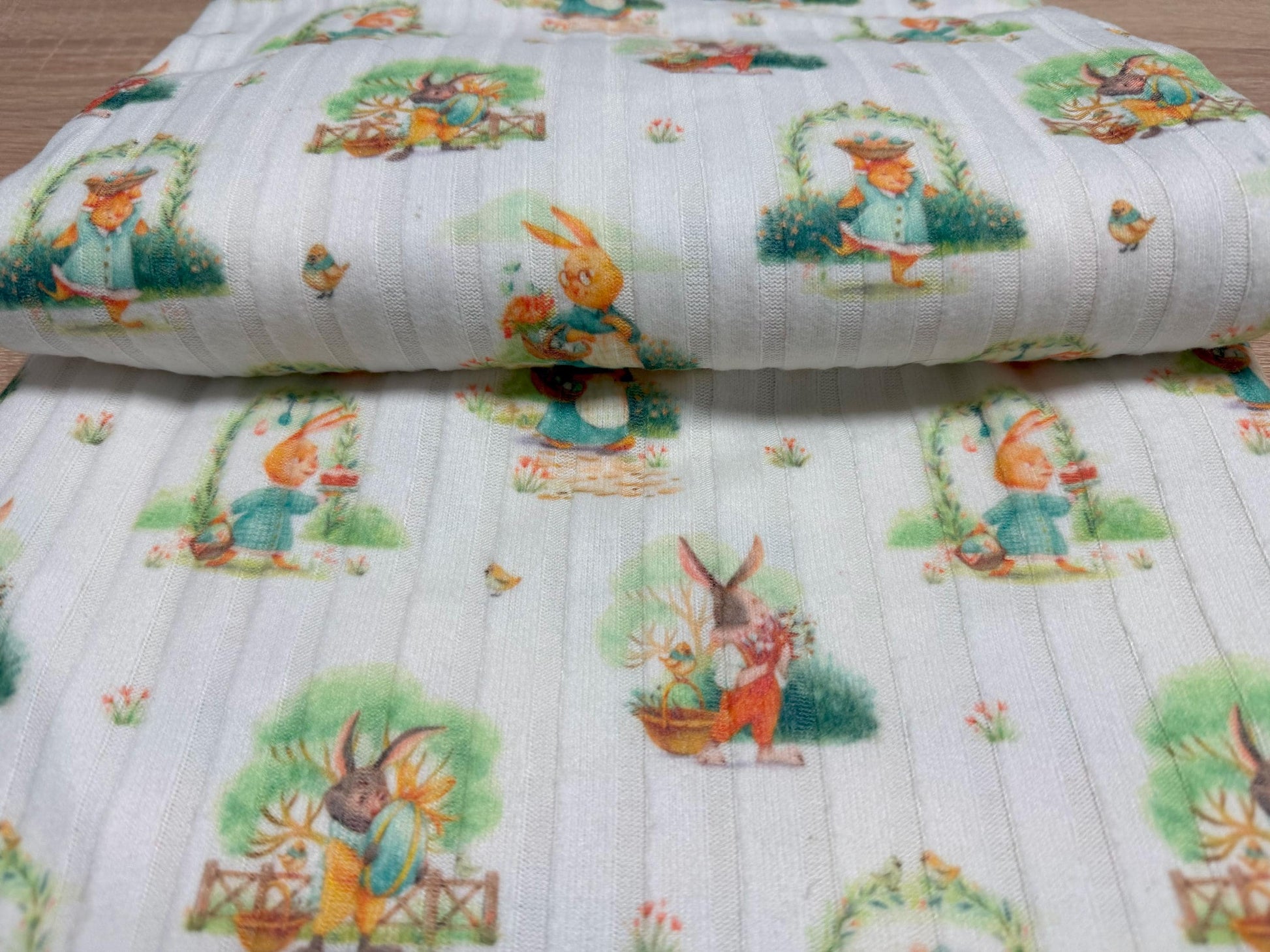 Bu büyüleyici kumaş, projelerinize doğadan ilham alan bir zarafet dokunuşu eklemek için mükemmel olan hoş tavşan ve bitki desenlerine sahiptir. 65'i pamuk ve %35'i polyesterden oluşan dayanıklı bir karışımla üretilen bu kumaş, pamuğun yumuşaklığını polyesterin sağlamlığıyla birleştirerek el işleri, terzilik ve ev dekorasyonu için idealdir. Tasarım, canlı ve kalıcı renkler sağlayan hassas bir transfer baskı tekniği kullanılarak oluşturulmuştur.