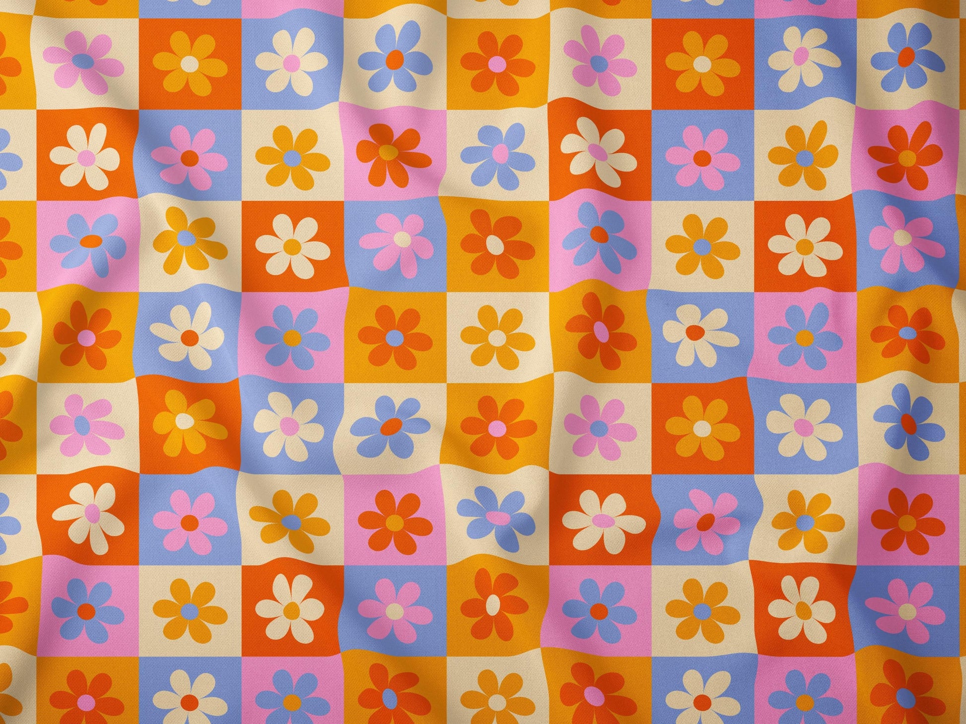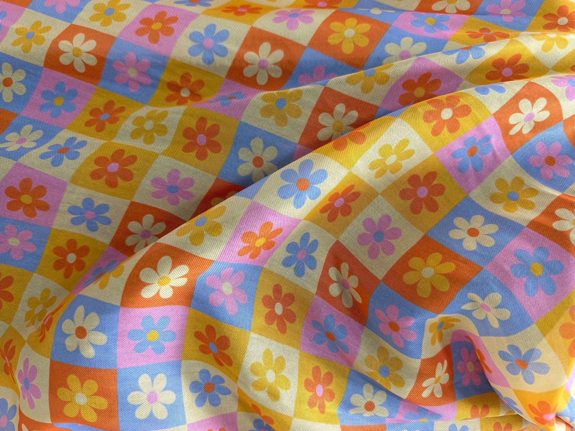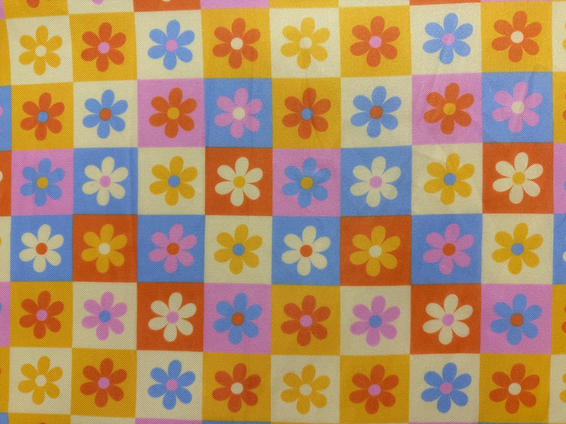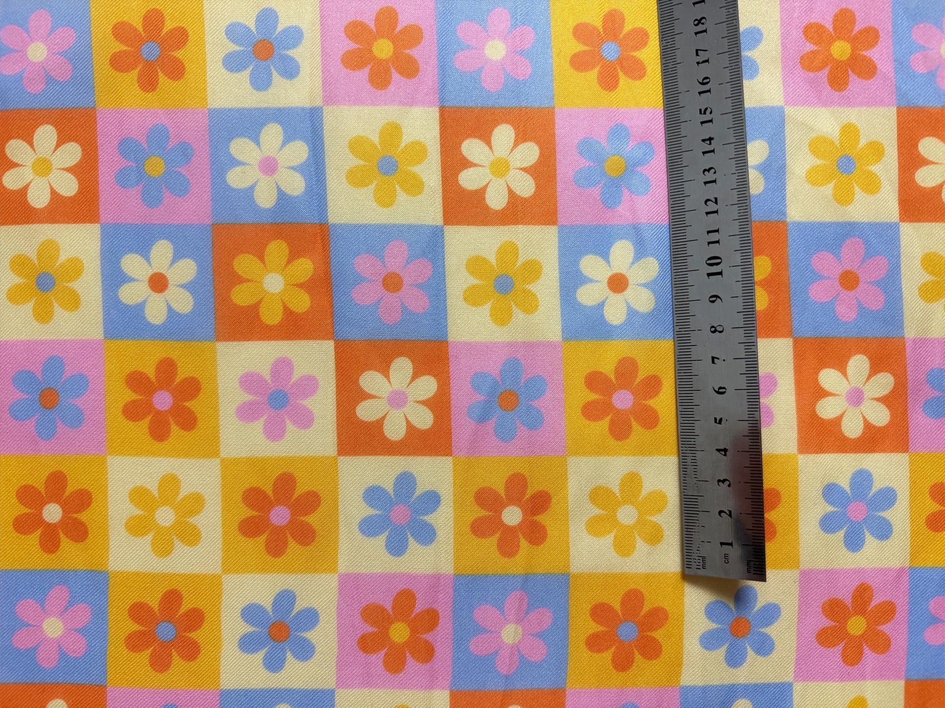 Retro Papatya Dama Tahtası Kumaş - Müslin, Poplin, Keten, Saten, Denim, Gabardin, Avluya Göre Su Geçirmez Kumaş Üzerine Renkli Çiçek Baskısı
